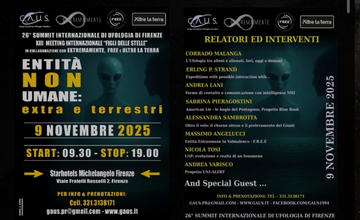 Le 9 novembre 2025 s’est tenu le 26ième sommet international d’ufologie dans la ville de Florence (Italie) à l’instigation du GAUS (Gruppo Accademico Ufologico Scandicci).